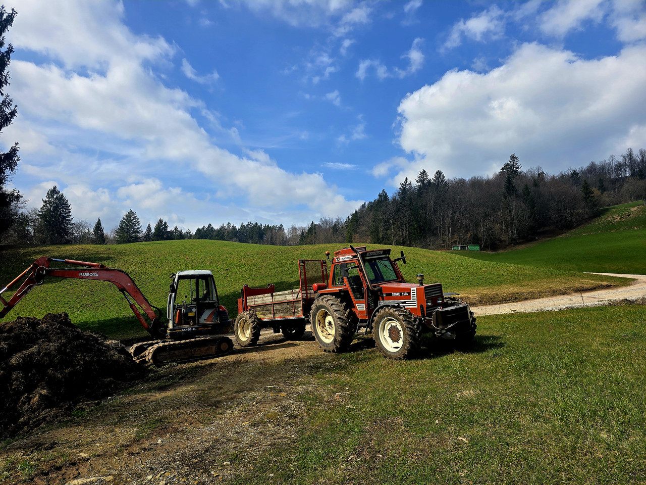 Se pa na posnetku vidi, da vozi po cesti in gnoji travnik. Verjetno je moral narediti prostor za gnojevko so spomladanskega razvoza. |